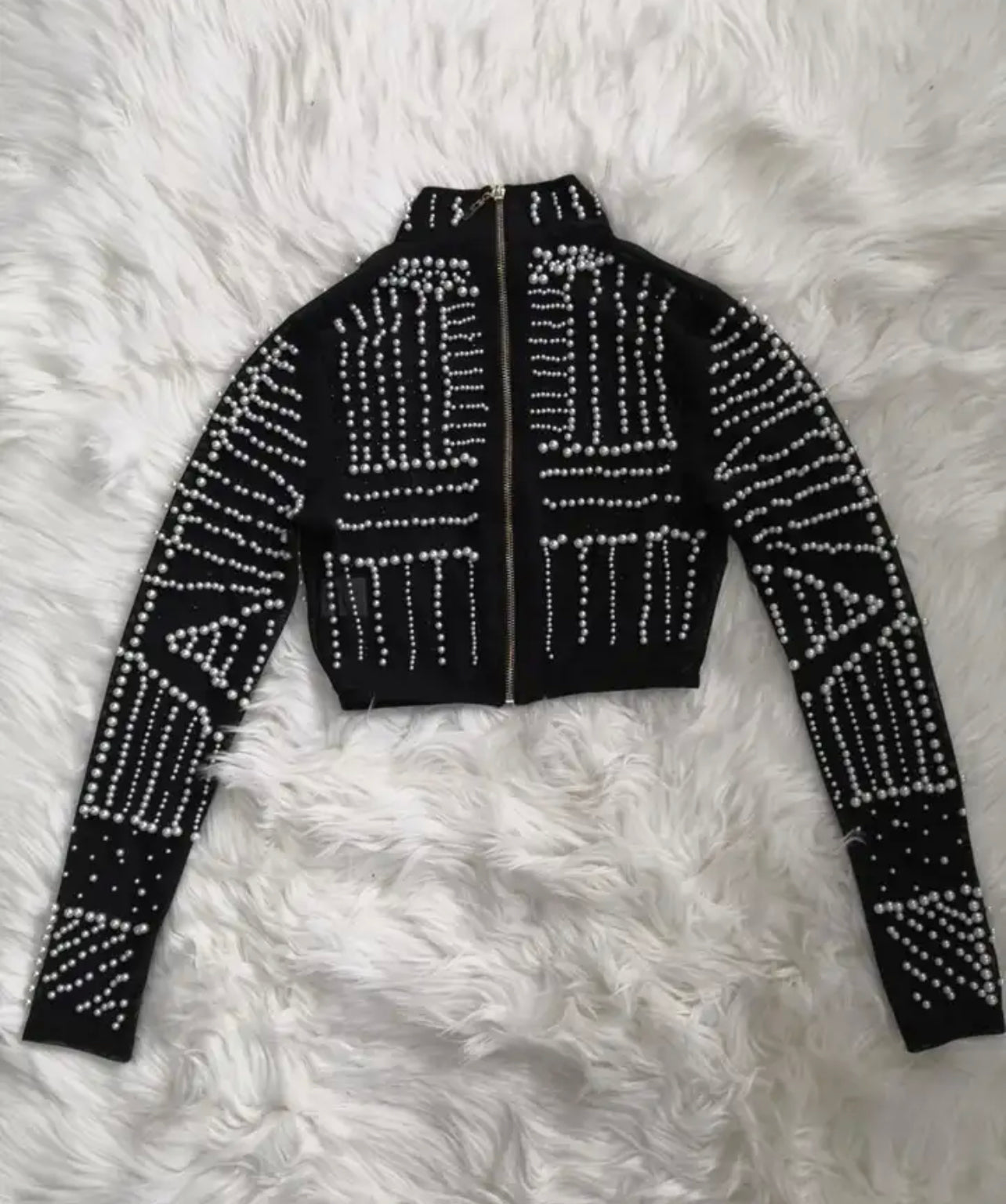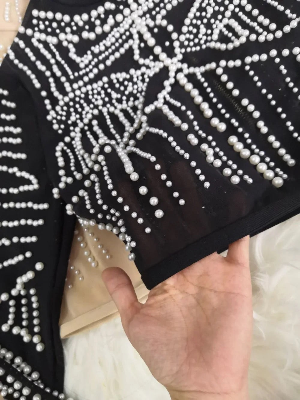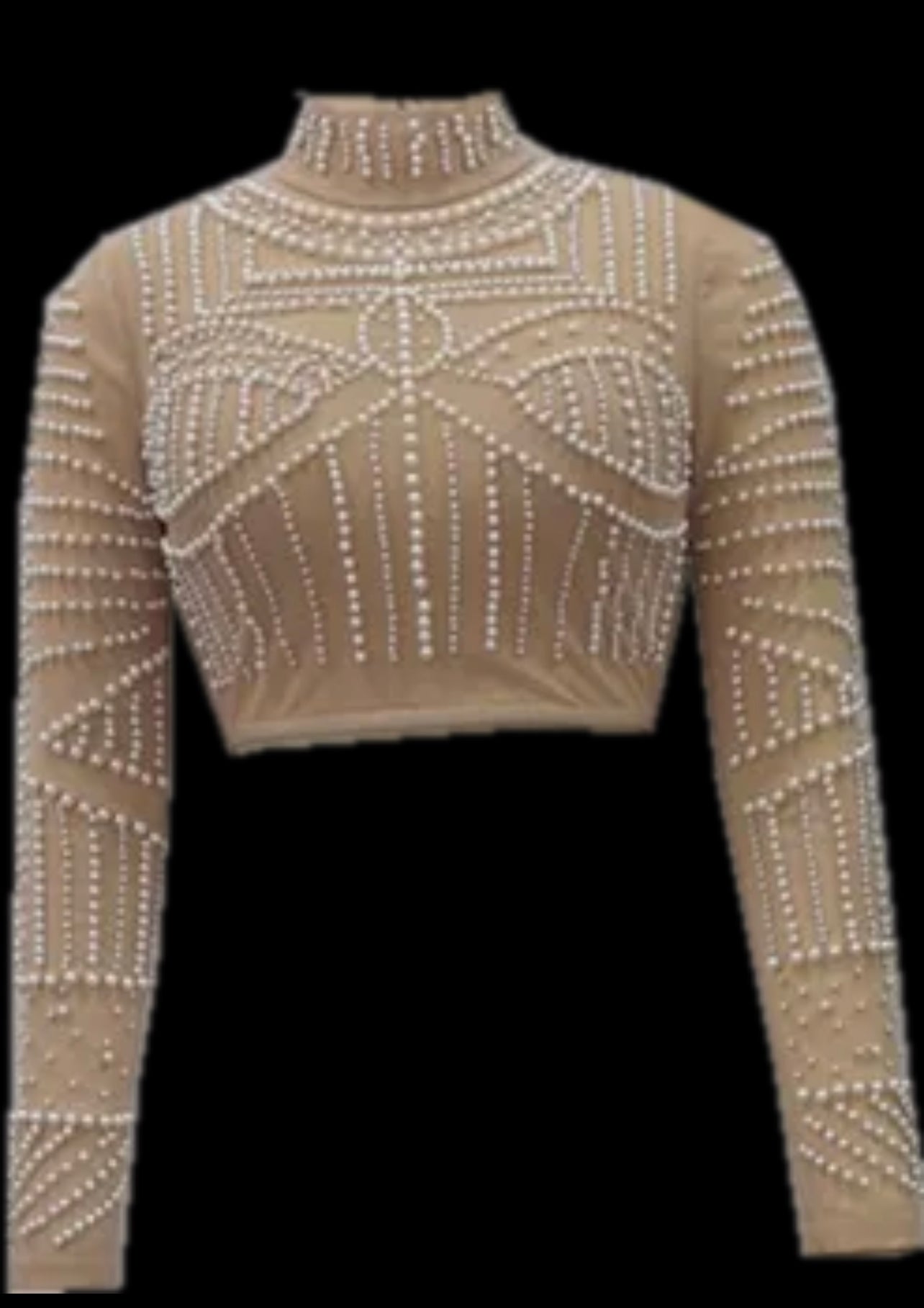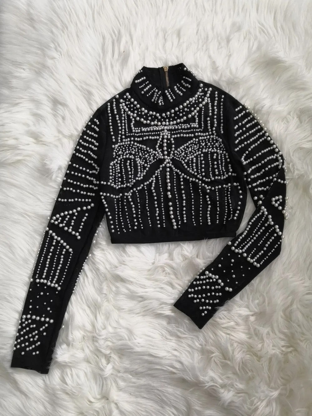 Black Pearls Beaded Mesh Long Sleeve Crop